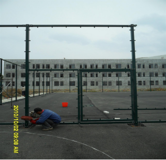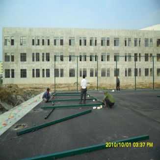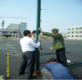 在地面上把若干组立柱和横梁通过连接件和防盗螺栓连接到一起,把连接好的一组框架竖立到预埋件的上面,位于预埋件中心位置,用水平尺把立柱校正垂直于地面;用电焊把立柱与预埋件焊接在一起(四面都要满焊);框架焊接好以后,用横梁把各个框架连接到一起,组成整体框架;立柱焊接完毕后把门框连接到一起,并与框架组合到起。