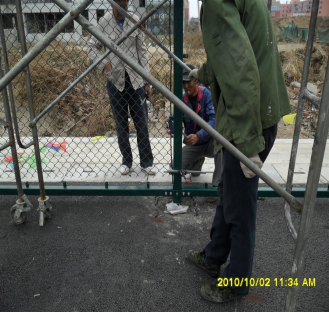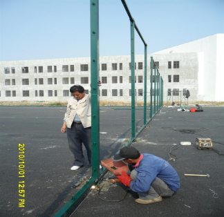 把编织网的包装打开,平铺在地面上,把每根网丝调整整齐,并把上下两个边相邻的两根网丝拧到一起;把钢筋棍穿到网面的上面及左右两面,并拿到框架的位置;安装编织网的时候,首先通过螺栓把编织网悬挂在檴梁上面的U型槽里面,再用张紧器把网面左右两边通过螺栓和钢筋棍固定在左右两根立柱上面,最后把网面下边固定好。