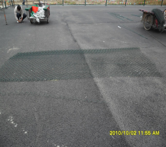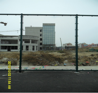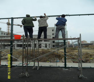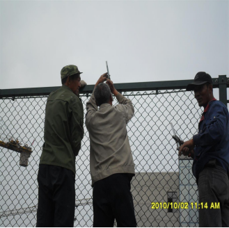 5、绷紧网片下面一根钢筋棍 6、安装好的网片